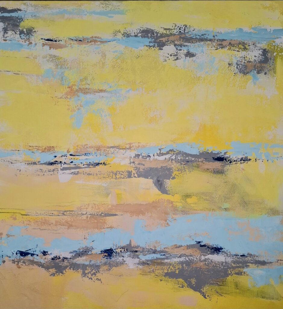 Ein frisches Acrylbild in einem sonnigen Gelb, etwas Hellblau und Grau